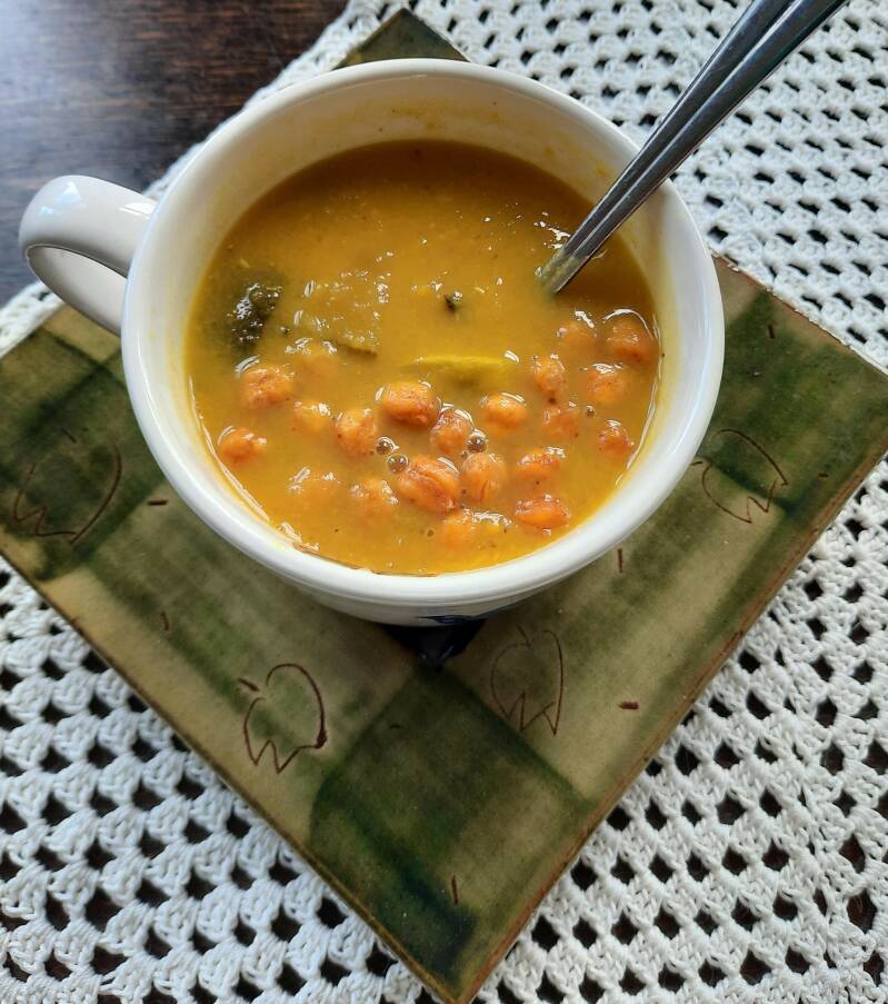 Hier zie je een toepassing van de geroosterde kikkererwten, als knappertje in je vers gemaakte soep. Van groente van eigen tuin. Hoe leuk is dat. Dit is courgette soep, met eigen gemaakte zoet zuur en de geroosterde kikkererwten.